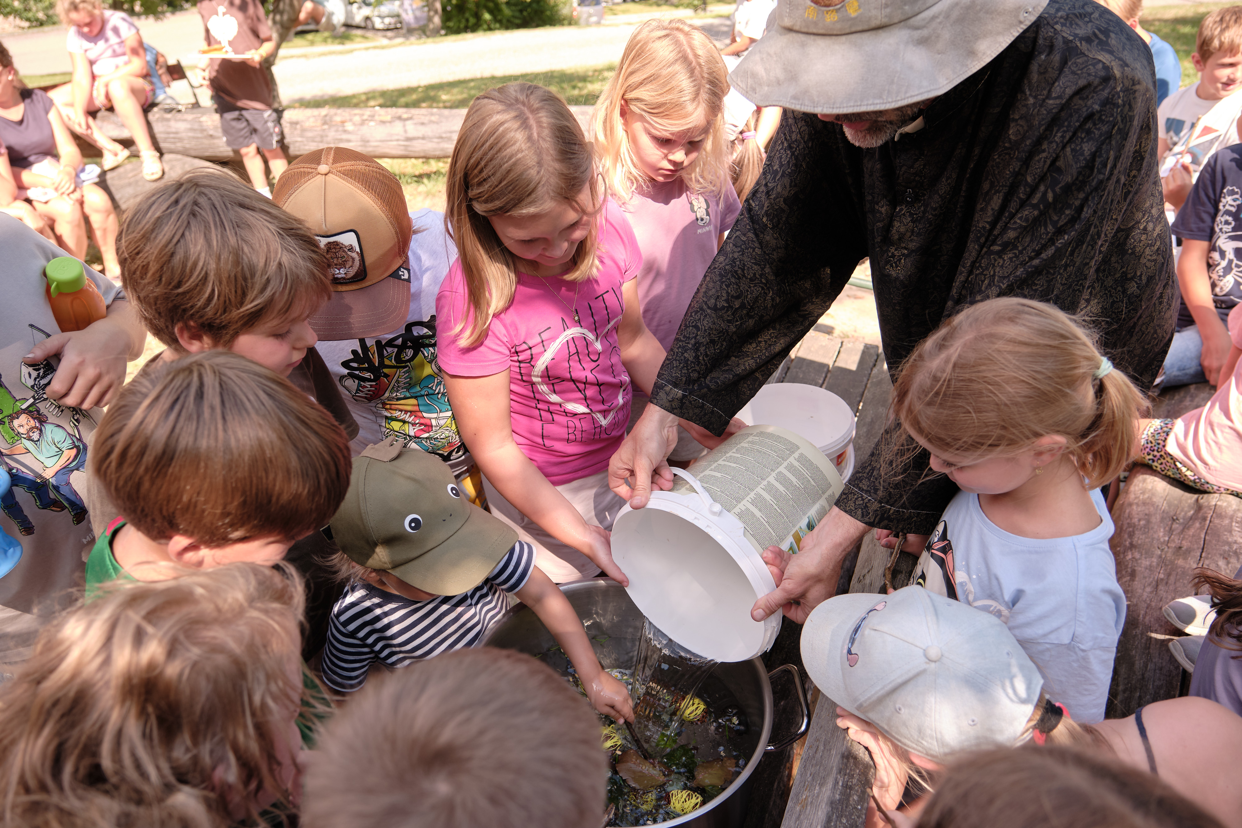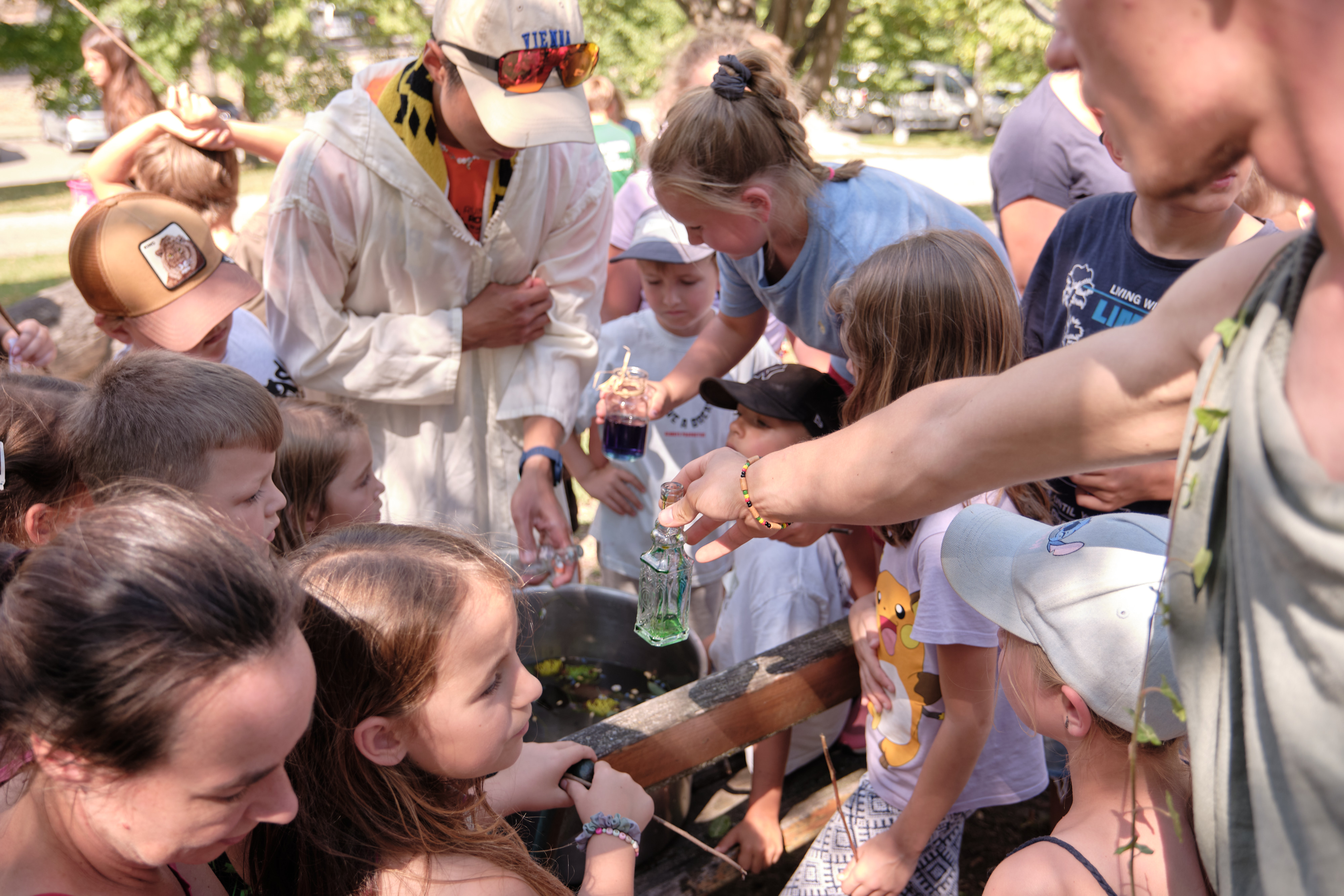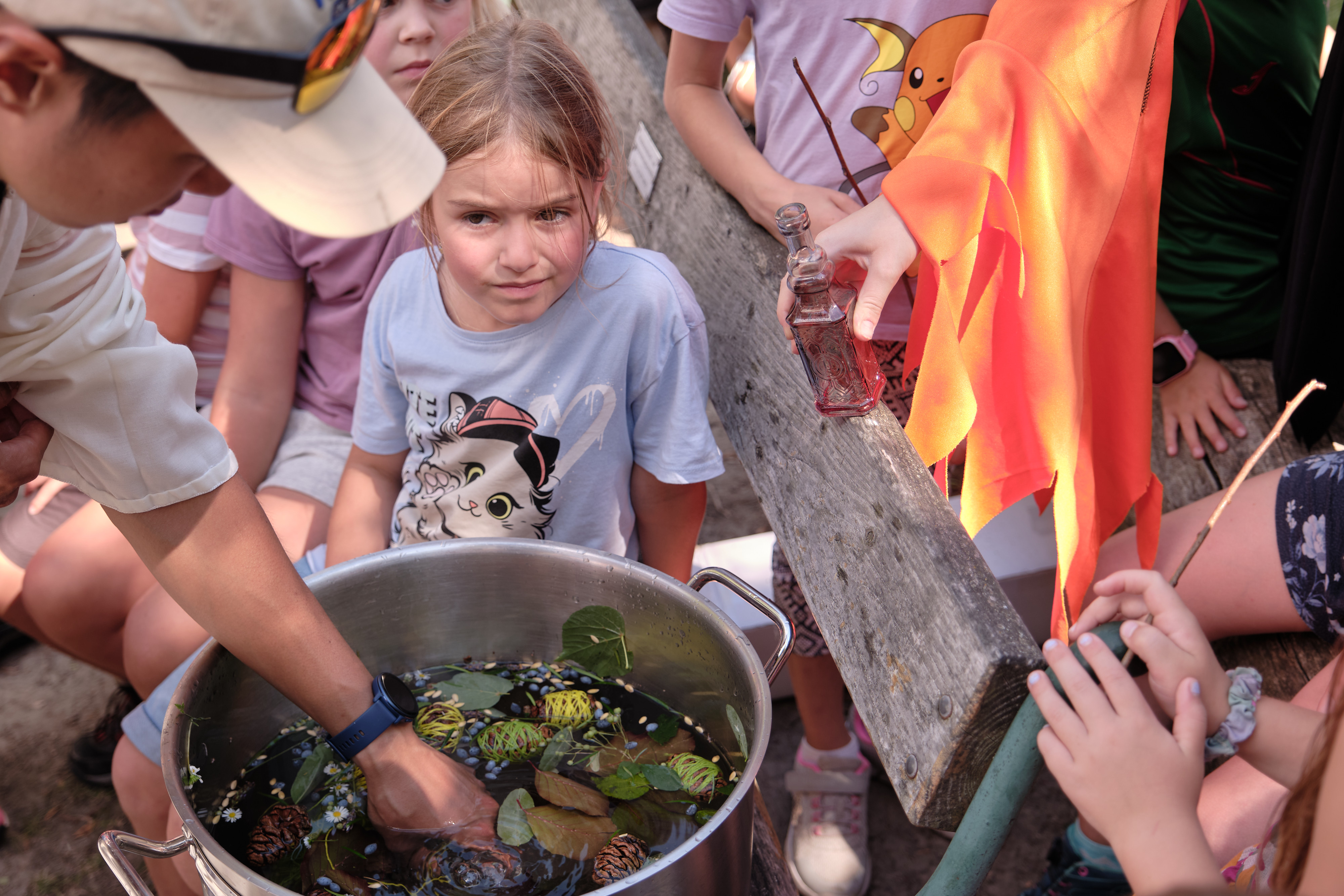 The children had to build Chinese trigram figures with the wood pieces at Chuangzi, match different animal species with the right category together with Sachamama, collect the golden cones in the Quidditch game and learn a spell in a foreign language with a support of Dumbledore, create different rhythm patterns for the music together with Euterpe and Krotos, play a memory game with insects and learn to make sound out of the Acacia leaf with the Emrys instructions, and dig out a secret potion recipe from a sandy pit with the help of Florence the Fairy!
